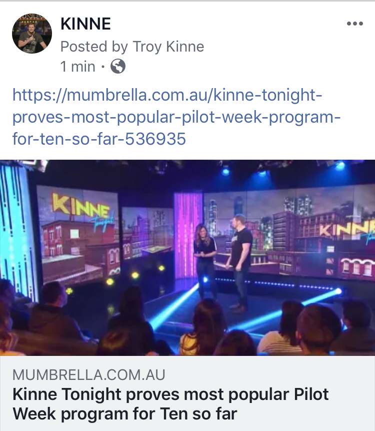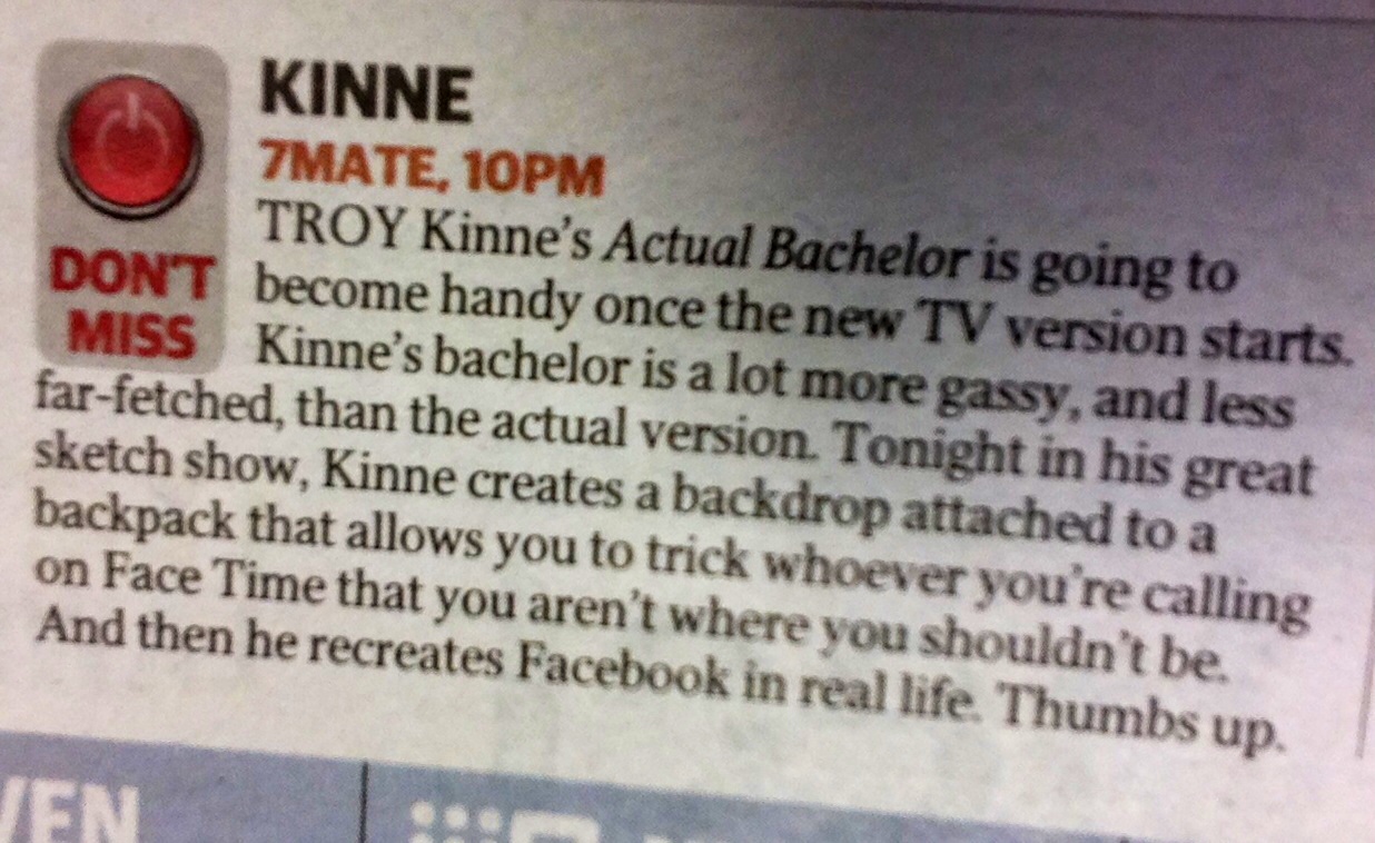 HoweverTroy is mostly known for his own Sketch Comedy TV shows - KINNE (7 Mate) and KINNE TONIGHT (CH10). The KINNE show saw Troy nominated for the 2015 Logie Award for Most Outstanding Newcomer and a number of sketches from his shows have racked up millions of online views worldwide.